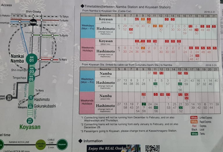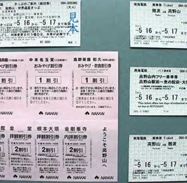 Je vous conseille ensuite d'acheter au guichet de la Nankai Koya Line (uniquement disponible là !) le pass Koyasan World Heritage constitué de plusieurs billets de train et bus pour tout votre séjour aller retour depuis Osaka. Tout le détail est accessible via les informations fournies par Nankai Line. Depuis mon départ il semblerait qu'une version digitale du billet existe à présent, accessible depuis le site web Nankai.