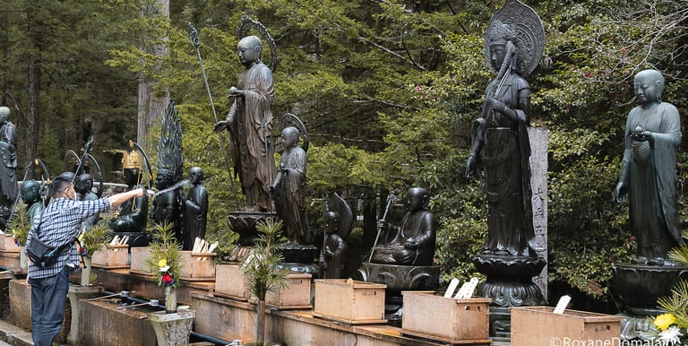 Plus loin, j'arrive à la salle des offrandes de Gokusho, où sont alignés des statues dédiées à Jizo, bodhisattva populaire veillant sur les enfants, les voyageurs et les âmes des défunts. Les visiteurs et pèlerins peuvent y effectuent des offrandes et y verser de l'eau sur les statues, pour de prier pour les membres de leur famille disparus.