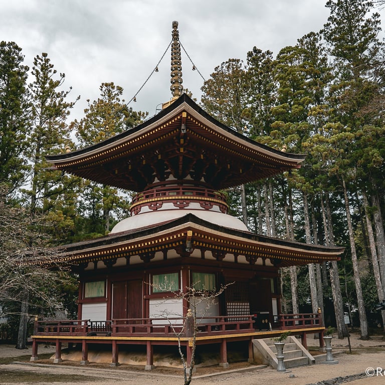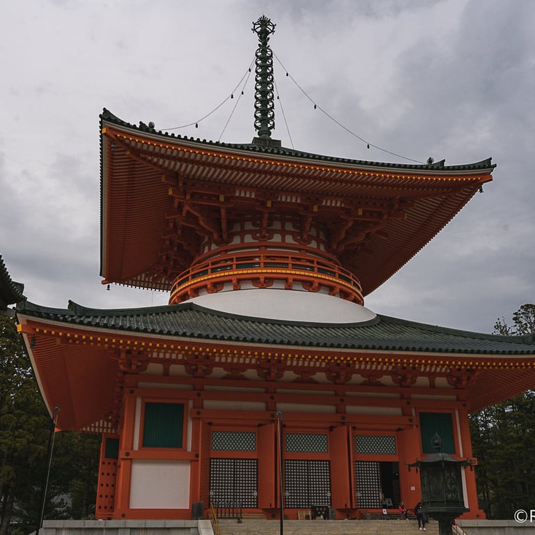 Kobo Daishi a érigé ce vaste complexe de temples, composé d'une vingtaine de bâtiments. La pagode du Konpon Daito est l'édifice le plus emblématique de Danjo Garan, positionnée au centre pour refléter un gigantesque mandala naturel en forme de lotus, formé par les huit montagnes environnantes de Koyasan.