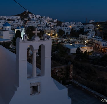 De nuit, le cœur de la ville prend une nouvelle couleur, beaucoup plus festive avec ses quelques bars qui se remplissent et ne se vident qu'au petit matin, où se mêlent touristes anglais et jeunesse grecque souhaitant éviter l'effervescence de son île voisine Mykonos.