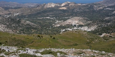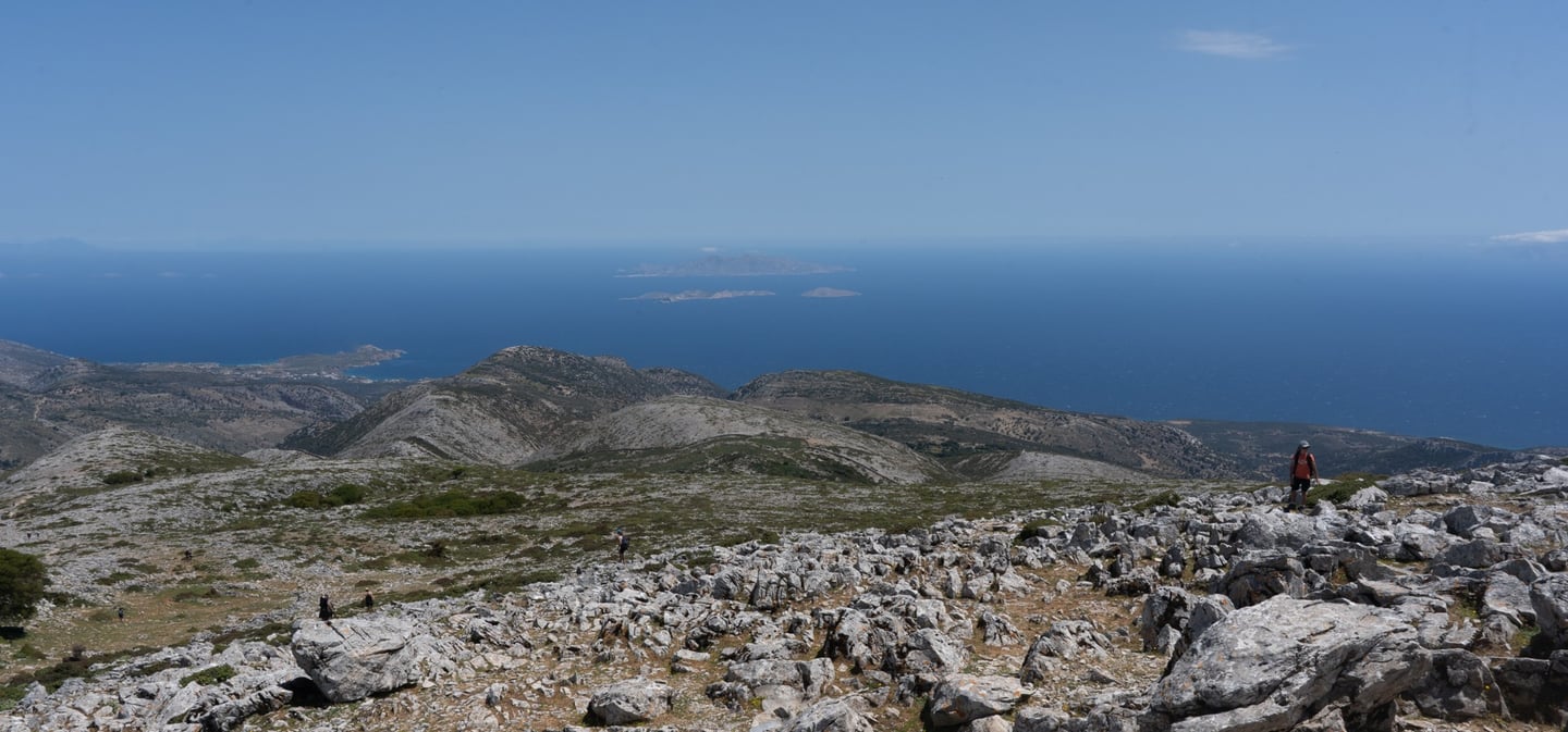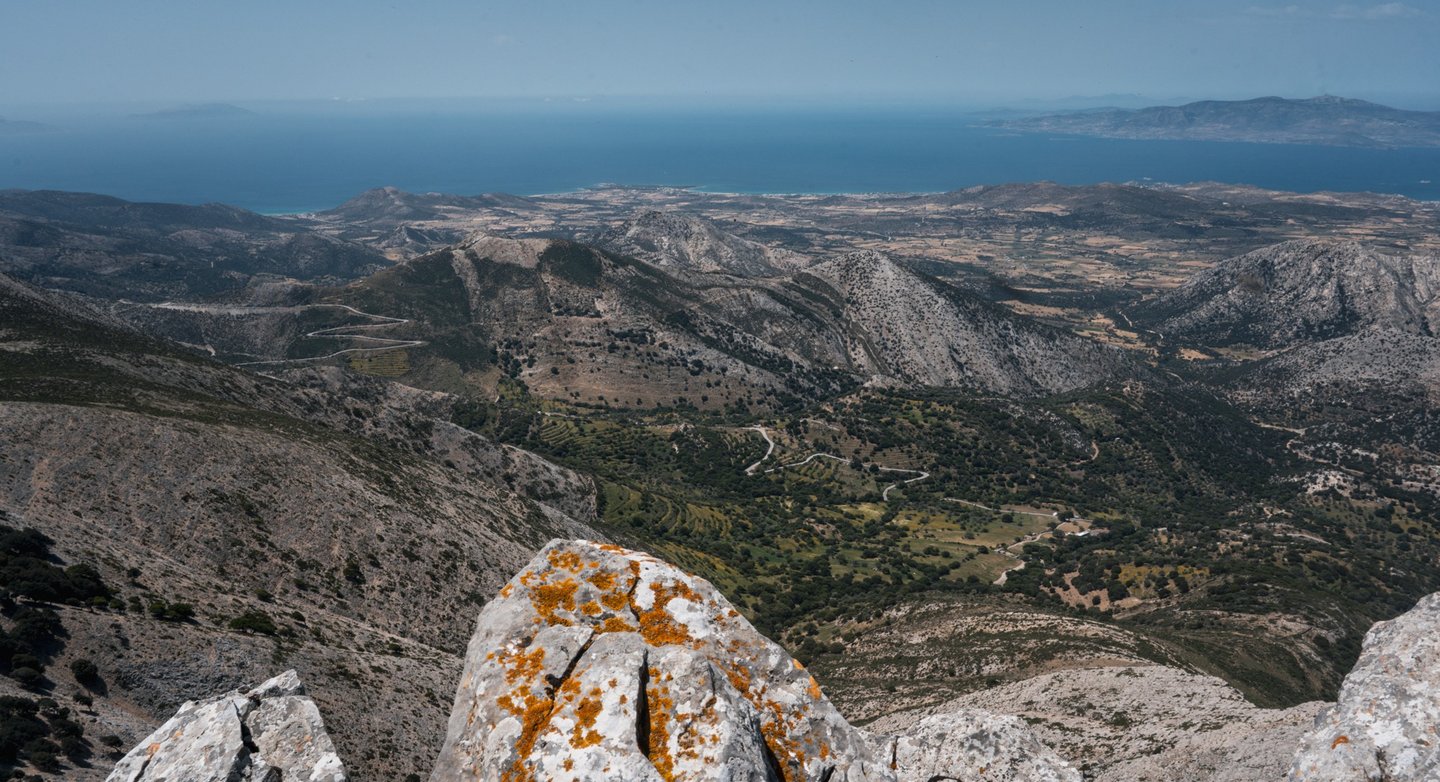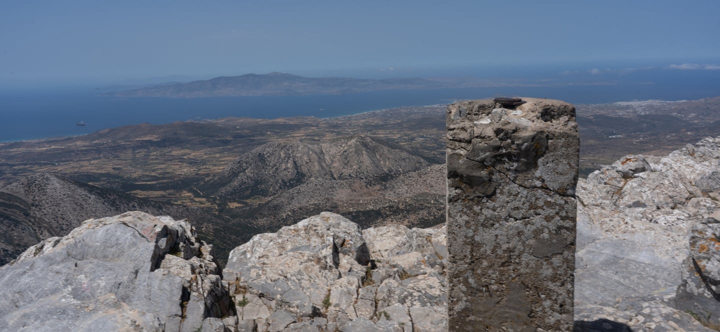 Dans un dernier effort, après un dénivelé total de 600 mètres, vous atteignez le sommet de l’île, le toit des Cyclades. La ville de Filoti paraît minuscule d’ici, la mer immense à l’horizon en toile de fond.